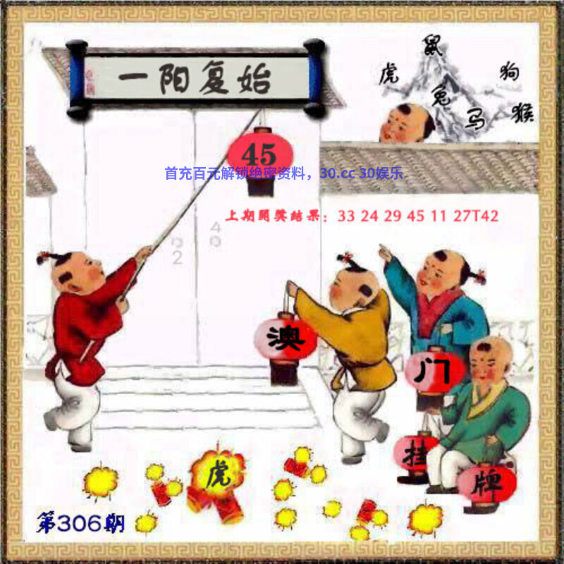306期正版彩图挂牌:挂:45 爆:虎 挂牌成语:一阳复始 挂牌出肖:兔猴马虎鼠狗